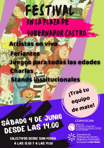 Además, continuando con las actividades, esta vez en conjunto con la Mesa Local de Atención y Prevención de la Violencia de Género y Familiar, el sábado 4 se realizará en la Plaza San Martín de Gobernador Castro, un festival con artistas locales, feriantes, emprendedores, stands institucionales, actividades lúdicas para todas las edades y charlas a cargo de los equipos de la secretaría de Políticas de Género, Mujeres y Diversidad.