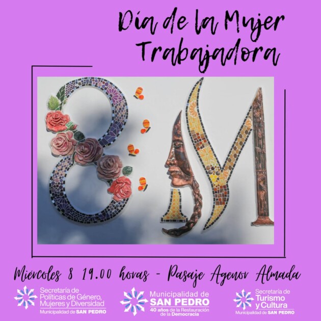 La Secretaría de Políticas de Género, Mujeres y Diversidad de la Municipalidad de San Pedro, en conjunto con la Secretaría de Turismo y Cultura, convocan a las actividades a realizarse el próximo miércoles 8, desde las 19.00, en el Pasaje Agenor Almada, donde se encuentra emplazado el mural alusivo a la fecha.