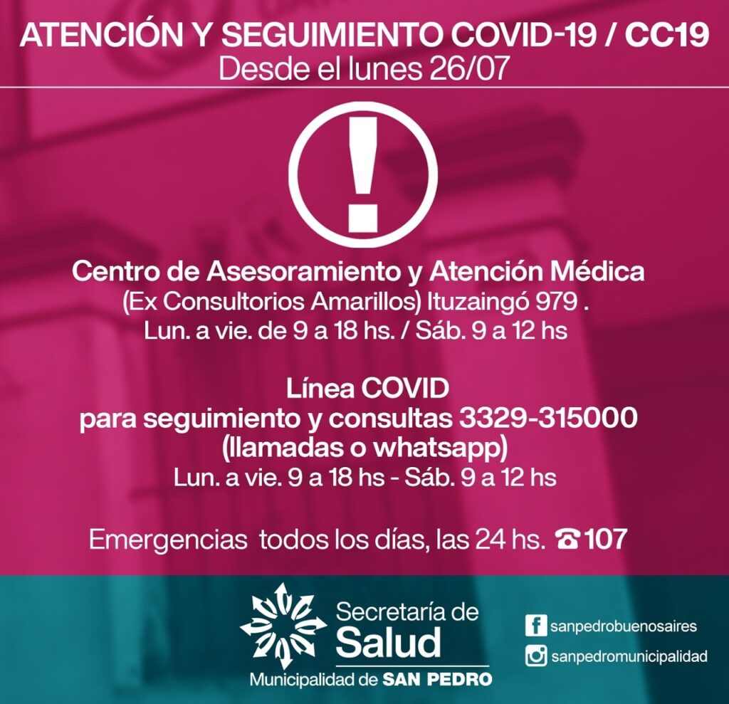 Lunes a viernes de 9 a 18 – sábados de 9 a 12 - Línea COVID para seguimiento y consultas 3329 315000