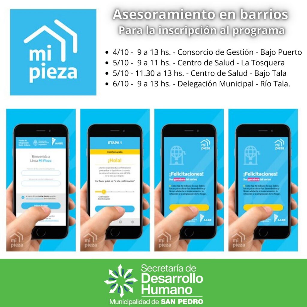 La Secretaría de Desarrollo Humano de la Municipalidad de San Pedro informa que a partir del lunes 4 de octubre se llevará a cabo un asesoramiento en barrios populares de la ciudad para capacitar a las personas sobre la inscripción al programa “Mi Pieza” que brinda asistencia económica para refacciones, mejoras y/o ampliaciones de las viviendas y está destinada a mujeres, mayores de 18 años, residentes en Barrios Populares del RENABAP.