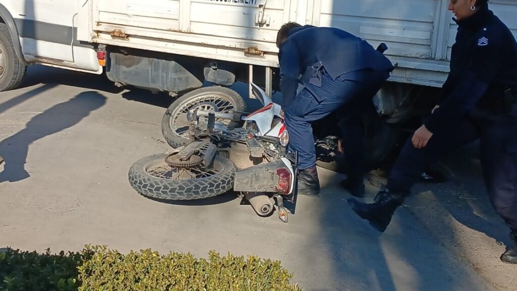 El incidente ocurrió cuando una motocicleta Honda XR, que circulaba en sentido Mansa, chocó contra la caja del camión al intentar ingresar al hotel. La colisión dejó la moto sin patente bajo las ruedas del vehículo de mayor porte.