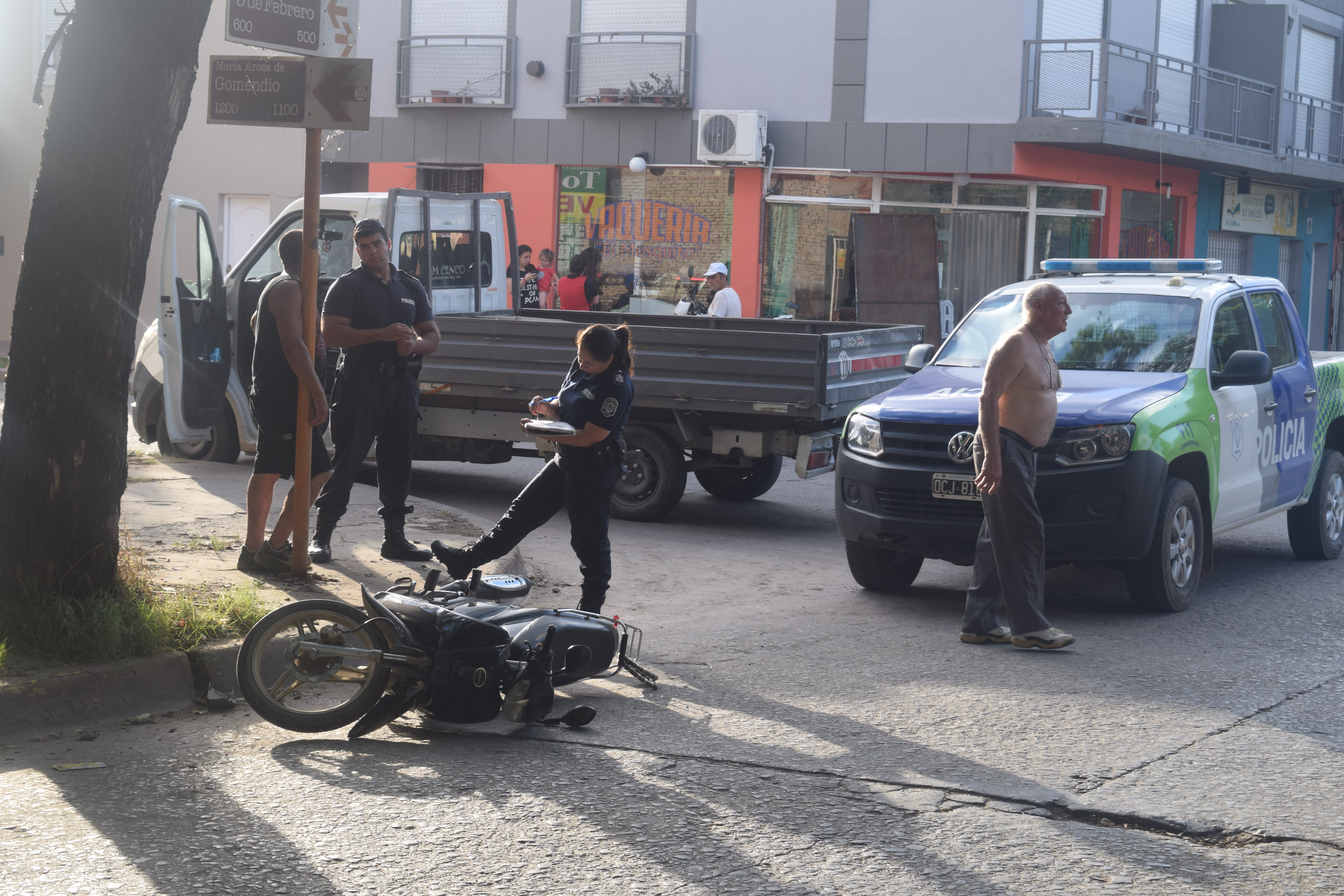 En la tarde de hoy alrededor de las 16:15 hs se produjo un accidente de tránsito en la esquina de Aníbal de Antón y 3 de Febrero, un joven que circulaba en una motocicleta Corven tipo cross roja 125 cc sin casco colisionó con un automóvil Wolksvagen Gol Gris.