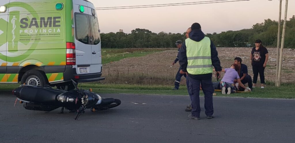 Por causas que se tratan de establecer el conductor del ciclomotor perdió el control cayendo junto a la acompañante, a la cinta asfáltica. La mujer sufrió una fractura de tobillo mientras que el hombre un traumatismo de cráneo con perdida de conocimiento. Ambos fueron asistidos por un equipo médico del SAME y derivados luego al nosocomio local.