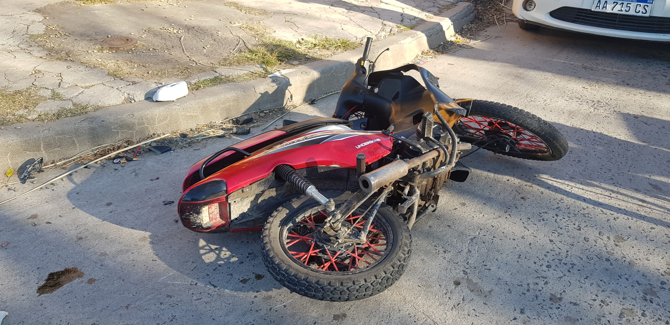 En la intersección de las calles San Martín y Romulo Nahon se produjo un accidente de transito entre una motocicleta 110 cc en la que circulaban un joven y un joven por calle San Martín cruzando el semáforo en verde, es impactada por otro ciudadano que circulaba solo en otra moto tipo 110 cc que transitaba por Romulo Naon cruza el semáforo en rojo produciendo el accidente.