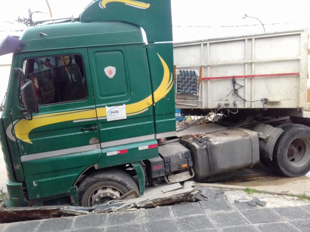 Esta mañana se produjo un hecho muy particular en la intersección de calle Mitre e Italia, un camión con un semi acoplado intento doblar cuando circulaba por Mitre, se subió a la vereda, cayo a la alcantarilla rompiendo la boca de tormenta quedando encajado en el lugar.