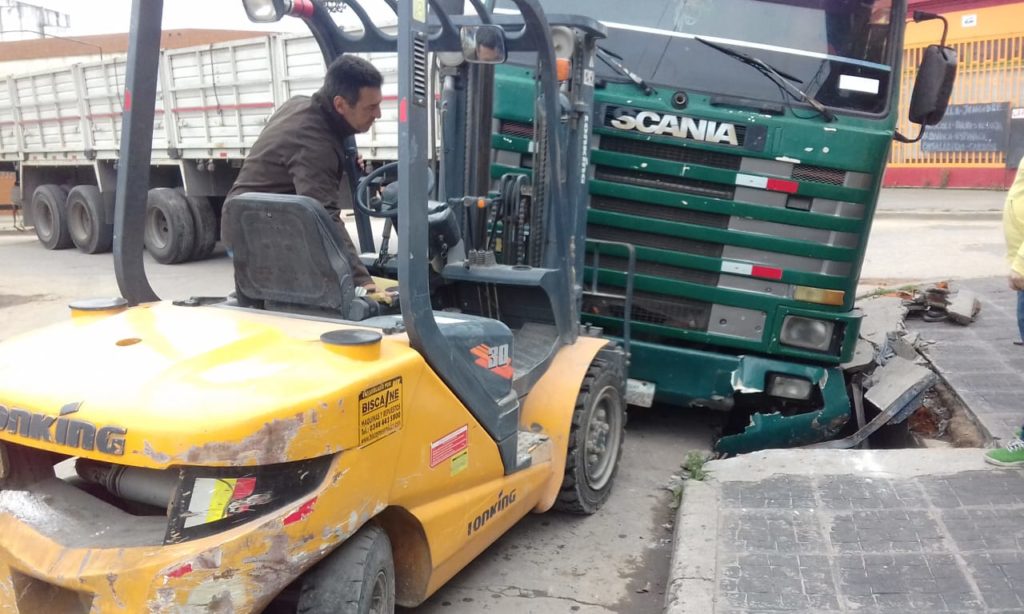 «doblo muy abierto, se subió arriba de la vereda y rompió la boca de tormenta, que fue lo que ocasiono que fuera tan difícil sacarlo, se intento tirar para atrás dos veces pero no se pudo, y finalmente se pudo levantar con un shale, es una zona que no pueden transitar estos camiones, pero no lo podemos dejar pasar , esto nos cuesta mucho dinero, ahora hay que repararlo, tenemos que volver hacer la basa, la tapa de hormigón , todo de nuevo».