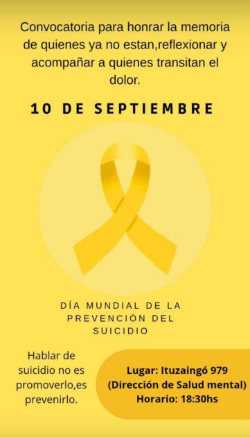 En el marco del Día Mundial de Prevención del Suicidio, la agrupación “Estamos Juntos San Pedro” llevará adelante una actividad hoy a las 18:30 horas en Ituzaingó 979, sede de la Dirección de Salud Mental de la Municipalidad de San Pedro.