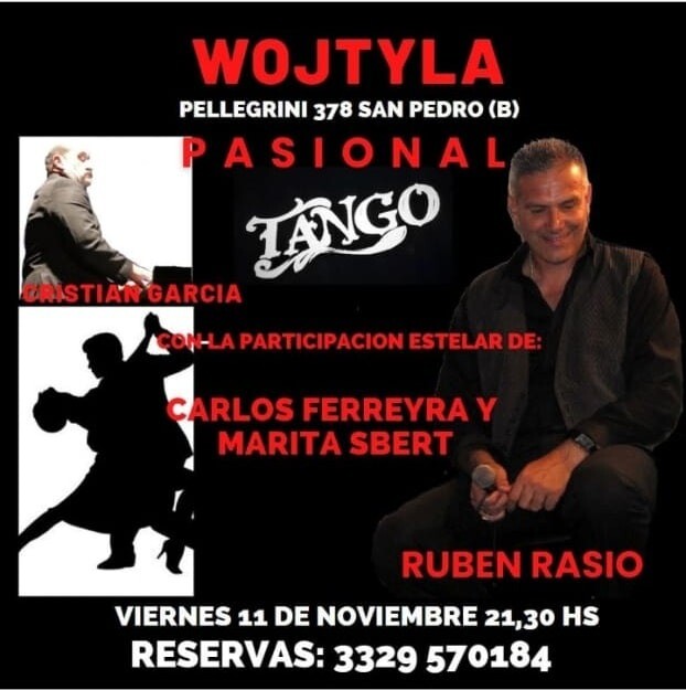 21.30 hs. En el teatro Wojtyla, ubicado en Pellegrini 378, se presenta “Pasional Tango” con la participación de Cristian García, Ruben Rasio, Carlos Ferreyra y Marita Sbert. Reservas al 03329-15570184.