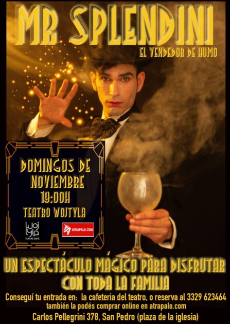 19.00 hs. En el teatro Wojtyla, ubicado en Pellegrini 378, se presenta “Mr. Splendini, el vendedor de humo”. Un espectáculo mágico para disfrutar con toda la familia. Para reservas contactar con el 03329-15623464.
