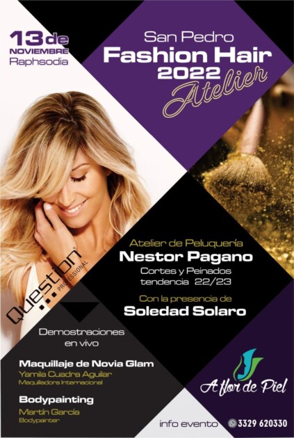 13.00 hs. Atelier de Peluquería de Néstor Pagano en Raphsodia Eventos, ubicado en Av. Sarmiento 2000. Se desarrollará una jornada donde habrá cortes y peinados de tendencia, Body painting a cargo de Martín García, Maquillaje de Novia Glam a cargo de Yamila Cuadra Aguilary la presencia de Soledad Solaro.