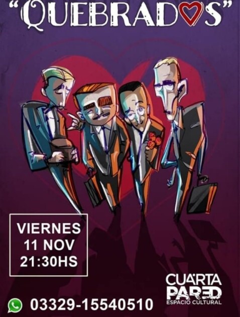 21.30 hs. En la sala Cuarta Pared, ubicada en Independencia 425, se presenta la obra “Quebrados”. Para reservas contactar con el 03329-15540510.