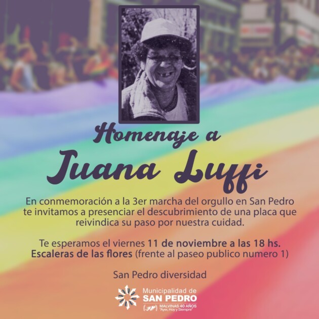 18.00 hs. en la Escalera de las Flores, frente al Paseo Público Municipal se realizará un homenaje a Juana Luffi en el marco de la conmemoración de la tercera marcha del Orgullo en San Pedro, se invita a presenciar el descubrimiento de una placa que reivindica su paso por nuestra ciudad.