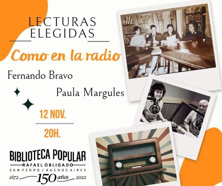 20.00 hs. En la Biblioteca Popular Rafael Obligado, continuando con las actividades en el marco de su 150° aniversario se desarrollará la actividad “ Lecturas Elegidas, como en la radio” con la participación de Fernando Bravo y Paula Margules.