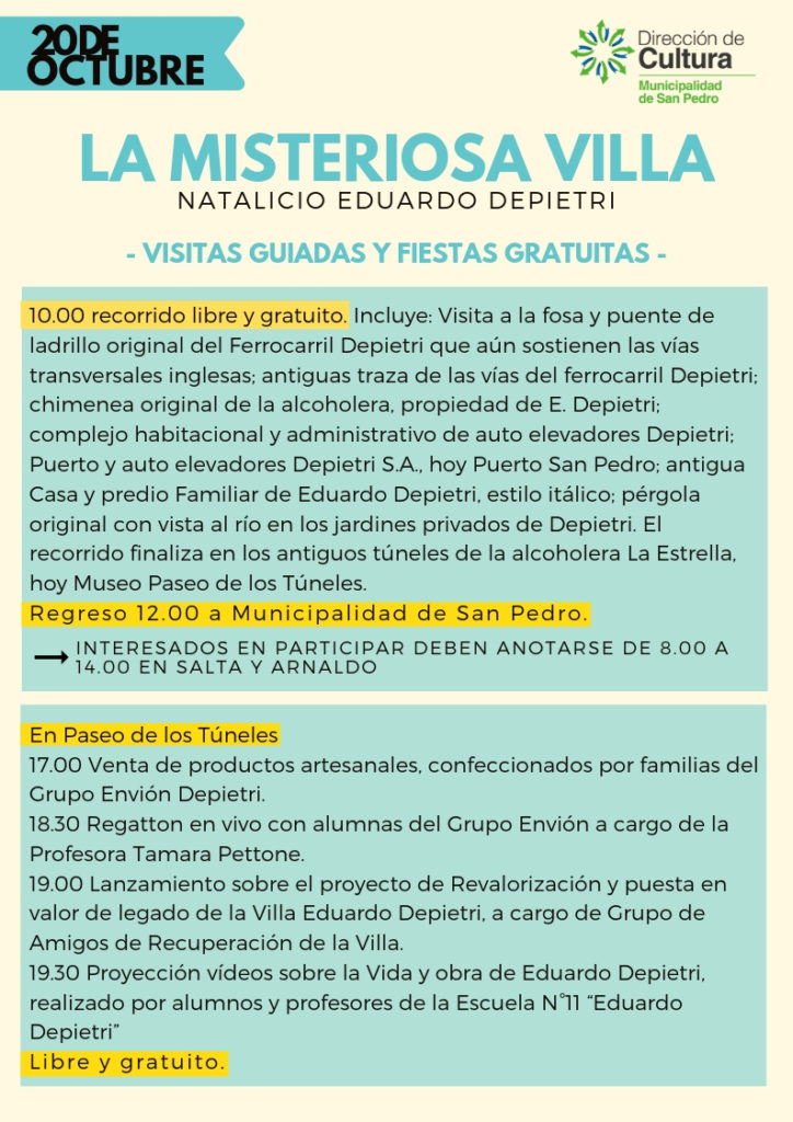 La Dirección de Cultura de la Municipalidad de San Pedro lo invita a participar de las actividades programadas para el sábado 20 de octubre en conmemoración al natalicio de Eduardo Depietri.