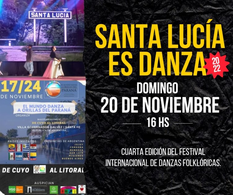 Santa Lucía es Danza: El domingo 20 de noviembre desde las 16 hs. en la localidad de Santa Lucía se llevará a cabo la cuarta edición del festival internacional de danzas folklóricas.