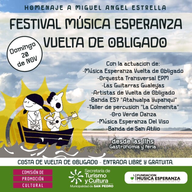 Festival Música Esperanza Vuelta de Obligado: El domingo 20 de noviembre desde las 11.00 hs. en la costa de Vuelta de Obligado, con entrada libre y gratuita se desarrollará esta jornada en homenaje a Miguel Ángel Estrella que contará con la actuación de diferentes agrupaciones, talleres y ensambles del Partido. En caso de lluvia la actividad se pasa a la Escuela Secundara N° 5 de la localidad.