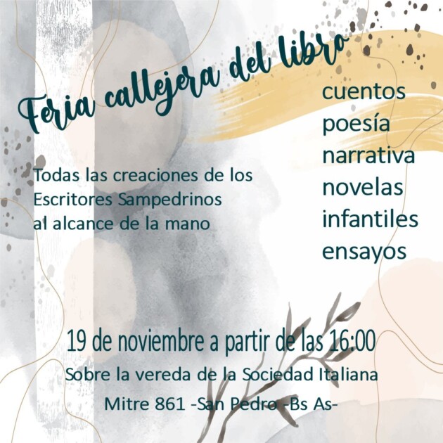 Feria Callejera del Libro: El sábado 19 de noviembre a partir de las 16.00 hs. sobre la vereda de la Sociedad Italiana ubicada en Mitre 861. Durante la actividad se podrán encontrar cuentos, poesías, narrativa, novelas, infantiles, ensayos y todas las creaciones de los escritores sampedrinos.