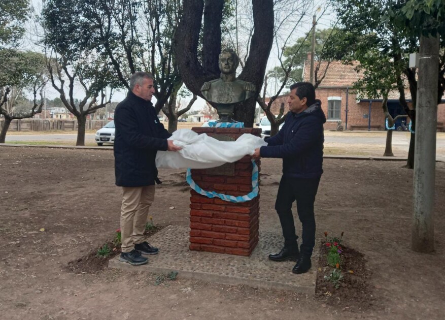 A continuación, el Intendente Salazar y el Delegado Álvarez destaparon el busto del General San Martín que fue colocado en la plaza que lleva su nombre a través del taller de Escultura de la Municipalidad, quienes confeccionaron la figura del Libertador.
