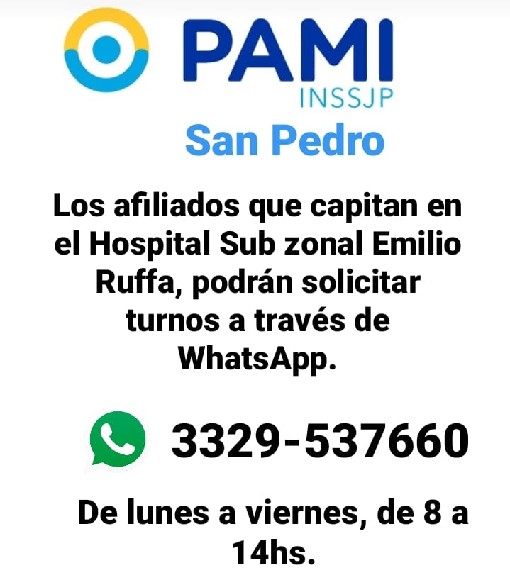La titular de la delegación PAMI San Pedro confirmó a través de las redes sociales que, a partir de ahora, aquellos/as afiliados/as que capitan en el Hospital Subzonal Emilio Ruffa, podráan obtener sus turnos para consultas con especialistas a través de Whatsapp.