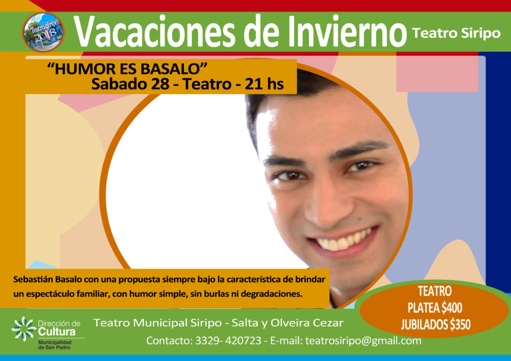 Sebastián Basalo con su unipersonal. Esta vez, la propuesta se titula “Humor Es Basalo”, siempre bajo la característica de brindar un espectáculo familiar, con humor simple, sin burlas ni degradaciones. El valor de la entrada es de $400, y para Jubilados con carnet $350.