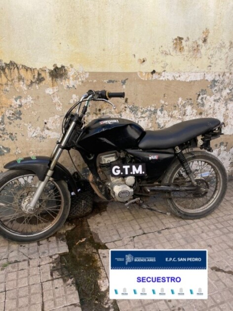 Por otra parte, durante el mismo procedimiento, los efectivos procedieron al secuestro de una motocicleta 150 cc de color negro, debido a que el rodado carecía de la documentación obligatoria para circular. En este caso intervino el Juzgado de Faltas, que continuará con las diligencias administrativas.
