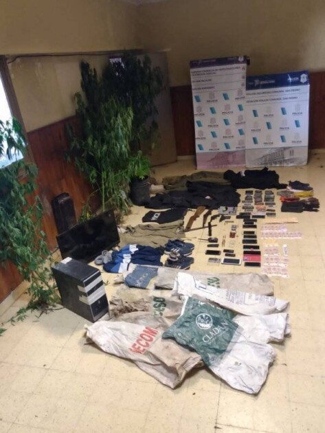 Se logró el secuestro de 6 plantas marihuana, cargador de pistola con 15 cartuchos distintos calibres, un handy con frecuencia policial, 42 teléfonos celulares, u$s 100, chaleco portante de policía, 26000 pesos en efectivo moneda nacional, pistolon sin marca ni numeración, rifle aire comprimido, prendas vestir utilizadas por los delincuentes, tv plasma 24 pulgadas, revolver calibre 32 y 4 cartuchos intactos, linterna, picana, bolsas arpilleras buscadas, pistola 635 con cargador y 3 cartuchos intactos, CPU, alhajas varias y guantes usados.