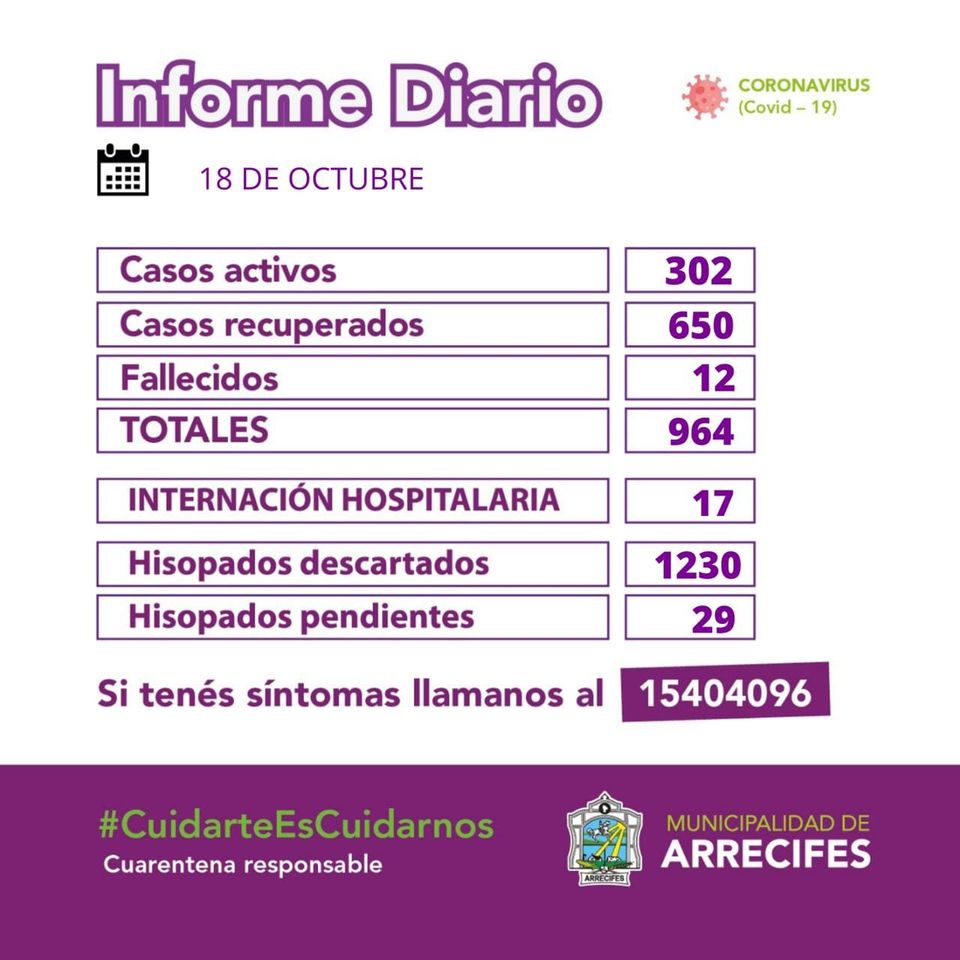 La Municipalidad de Arrecifes y la Secretaría de Salud informan que a partir de los cambios en el Protocolo de diagnóstico para COVID-19 dispuesto por el gobierno de la provincia de Buenos Aires, las estadísticas en nuestra ciudad reflejan la siguiente situación epidemiológica al día 18 de octubre de 2020.