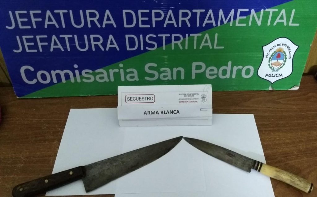 Por la noche del martes, personal policial procede a la aprehensión de un masculino de 36 años de edad, quien los ataca con dos armas blancas sin motivo alguno.