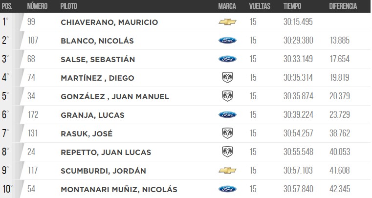 Diego Martínez, representante del JP Carrera, se mantuvo en pista y largó en el primer puesto. Sin embargo, Nicolás Blanco, que también se quedó en pista, se ubicaba segundo hasta la sexta vuelta, giro en el que sobrepasó a Martínez. Pero la lluvia empezó a parar. Y allí fue cuando aprovechó Mauricio Chiaverano.
