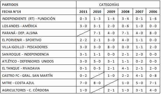 2010: Paraná 26, El Porvenir 24, Mitre 22, Atlético 22, Sportivo 20, General San Martín 19, Villa Igoillo 17, Rivadavia 15, San Roque 14, Independencia 13, El Tanque 11, Agricultores 9, Los Andes 8, Fundición 7, Dep. Alsina 7, Independiente (RT) 7, América 6, Pescadores 4, Costa Azul 3, Def. Unidos 0.