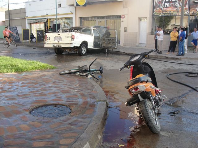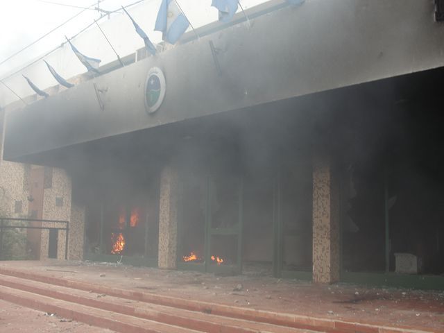 Un grupo de vecinos quemó la camioneta y luego se dirigieron hasta las escalinatas de la Municipalidad de Baradero, allí comenzaron los canticos, la quema de gomas, luego la rotura de vidrios y finalmente el incendio, la horda embravecida corría de un lugar a otro rompiendo y prendiendo fuego todo lo que tenían por delante, mientras la gente observaba desde los alrededores el triste espectáculo.