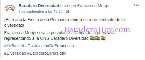 En un cambio de época y Cultural que atraviesa a todos por igual, la edición 2019 de la Fiesta de la Primavera de nuestra ciudad, en el contexto de la Elección de la Reina de Baradero, será la primera vez que tenga una postulante trans, la cual estará representando a la ONG ‘Baradero Diversidad’, ella es Francesca Monje.