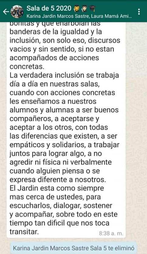 «Nos eliminaron del grupo de Whatsapp del jardín por ese comentario. La maestra le dijo por teléfono a mi esposa que por orden de un superior, creo que la inspectora, tuvieron que eliminarla del grupo porque tenía que haber un papá por familia; esa respuesta me parece ilógica.»