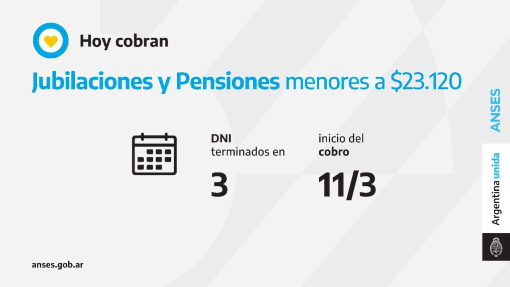 Las sucursales bancarias habilitadas atenderán por ventanilla a jubilados, jubiladas, pensionados y pensionadas con documentos terminados en 3 cuyos haberes NO SUPEREN la suma de $23.120.