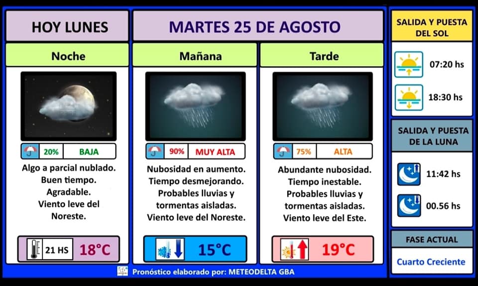 Desde la mañana ya comenzará a llover en varios sectores y se extenderá durante el mediodía y la tarde. A la noche, puede que no llueva debido a mejoras temporarias, pero la inestabilidad también abarca al día Miércoles, siempre con lluvias.