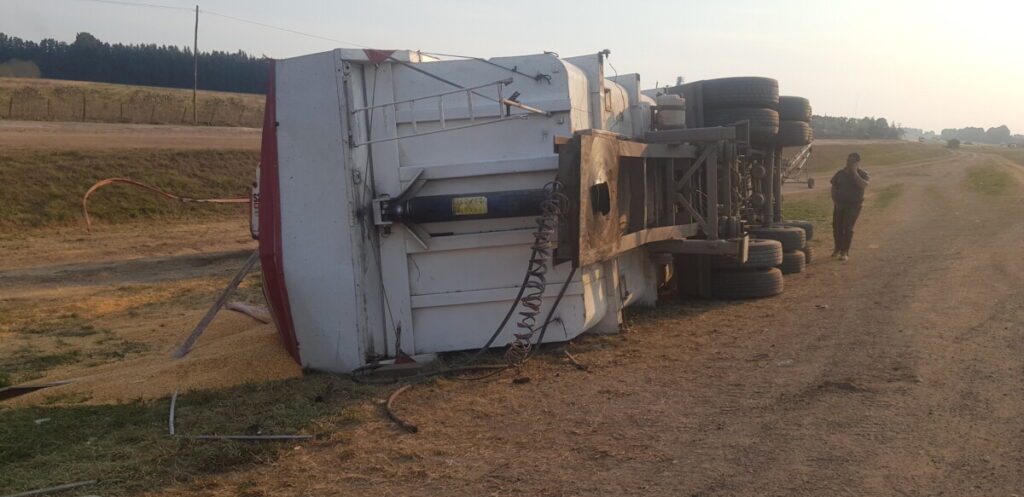 La policía de nuestra ciudad se hizo presente esta tarde cuando el camión perteneciente a una empresa de Arrecifes que trasladaba cereales por razones que se tratan de establecer perdió el control volcando su carga sobre la banquina en el carril Rosario Buenos Aires.