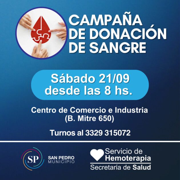 La Municipalidad de San Pedro, a través de la Secretaría de Salud, informó que el equipo de hemoterapia del Hospital Municipal Dr. Emilio Ruffa convoca a la comunidad a participar en una jornada de donación de sangre. La campaña se llevará a cabo el sábado 21 de septiembre, a partir de las 8 horas, en el Centro de Comercio ubicado en B. Mitre 650.
