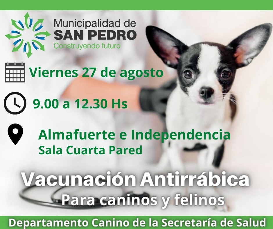 El Departamento Canino informa que, continuando con la campaña de vacunación para perros y gatos, este viernes 27 de agosto se instalará un equipo del área en la intersección de las calles Almafuerte e Independencia.