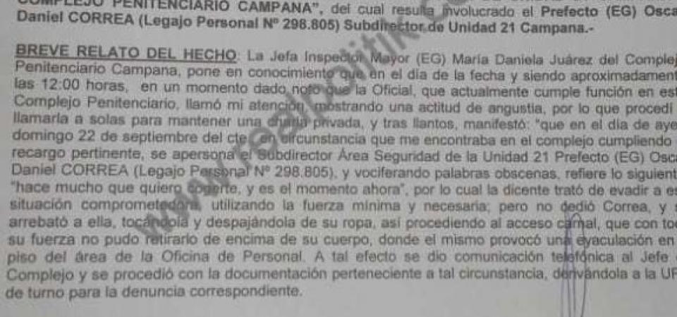Asimismo, la oficial contó que Correa la tomó contra su voluntad y la violó. “Con toda su fuerza no pudo retirarlo de encima de su cuerpo, donde el mismo provocó una eyaculación en el piso del área de la Oficina de Personal”, detalla el informe sobre el estremecedor relato de la agente del SPB que ahora deberá ser investigado por la Justicia.