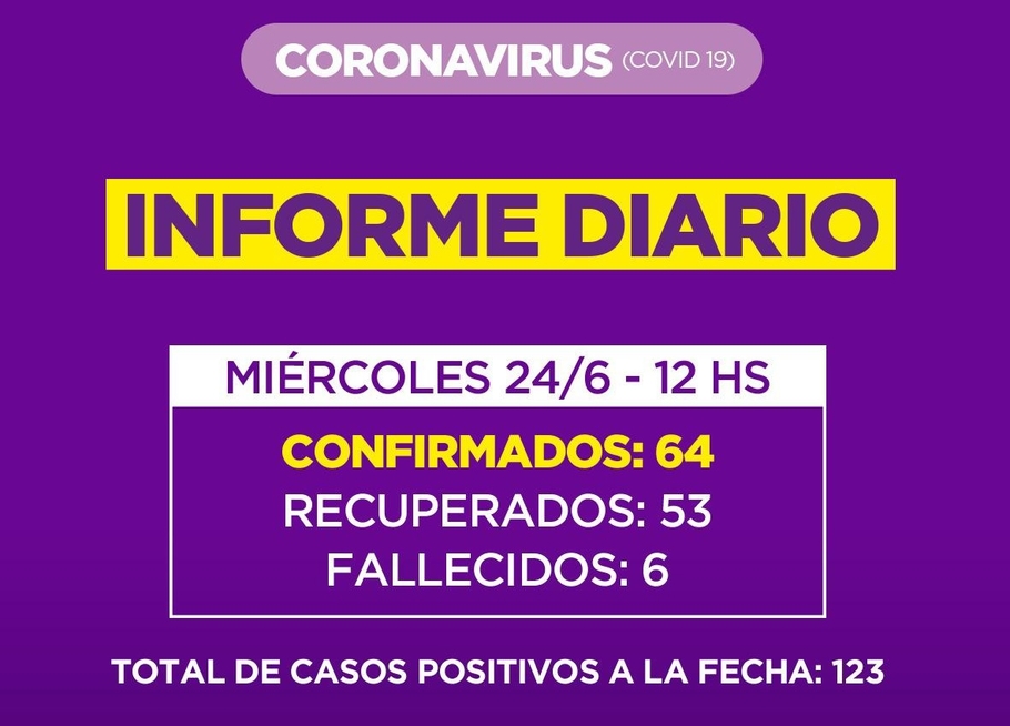 El parte diario difundido por la Comuna da cuenta de 64 contagios activos, sumando 123 las personas infectadas desde el inicio de la pandemia.