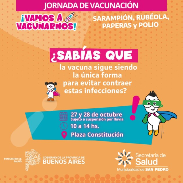 La Secretaría de Salud de la Municipalidad de San Pedro recuerda que este jueves 27 y el viernes 28 de octubre en el horario de 10 a 14 se desarrollarán jornadas de vacunación en Plaza Constitución.