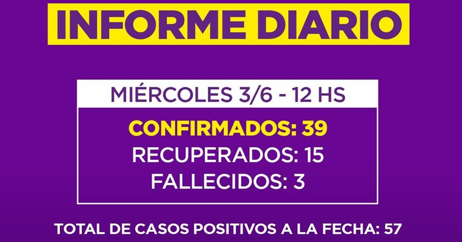 De 32 a 39 casos actuales (o Confirmados), se informó a través del parte oficial, que representa un poco más del 20% de contagios en, al menos, las últimas 24hs. Los casos de aquellos vecinos infectados y recuperados (15), y lamentablemente fallecidos (3), permanecen iguales.