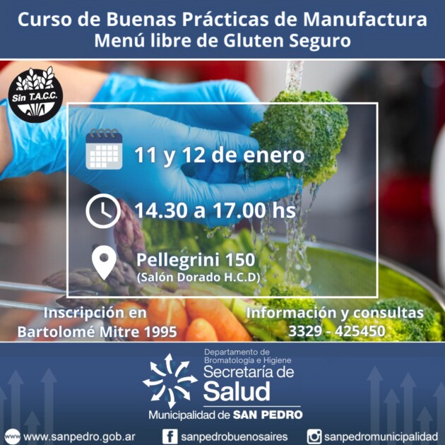La Secretaría de Salud de la Municipalidad de San Pedro, a través de su Departamento de Bromatología e Higiene informa que se realizará el curso de Buenas Prácticas de Manufactura y Menú Libre de Gluten Seguro, el cual es requisito obligatorio para todo aquel que se desempeñe en la manipulación de alimentos.