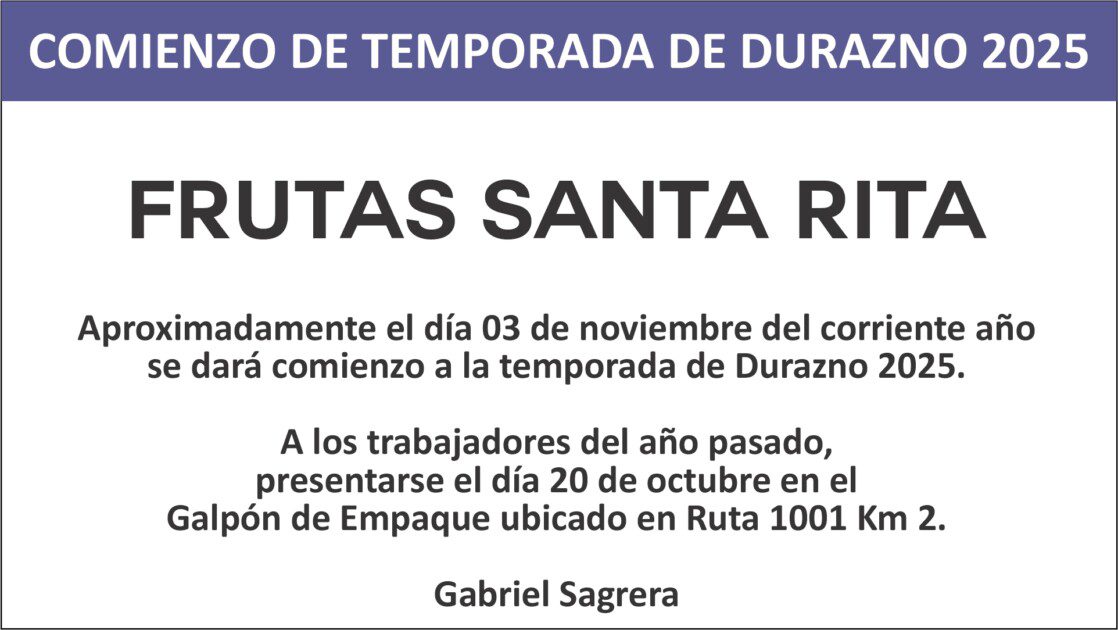 COMIENZO DE TEMPORADA DE DURAZNO 2025 FRUTAS SANTA RITA Aproximadamente el día 03 de noviembre del corriente año se dará comienzo a la temporada de Durazno 2025. A los trabajadores del año pasado , presentarse el día 20 de octubre en el Galpón de Empaque ubicado en Ruta 1001 Km 2. Gabriel Sagrera (Publicación válida […]
