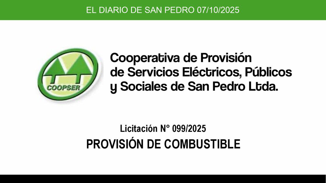 Provisión de Compresor Trifásico. Apertura: 02 de Febrero de 2026 a las 10:00 hs Informes y retiro de documentación de lunes a viernes de 7:00 a 13:00 hs. en Rómulo Naon 2499, Oficina de Compras, Obrador Coopser San Pedro o en www.coopser.com.ar . Tel 03329-431300 int 335/336