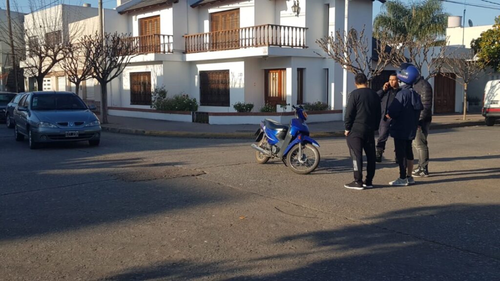 Este viernes pasadas las 9:30 hs por motivos que se tratan de establecer ocurrió un accidente de tránsito en la esquina de Las Heras y Rivadavia entre una motocicleta 110 cc conducida por un joven mayor de edad y un automóvil Ford Ka blanco conducido por una mujer joven mayor de edad.