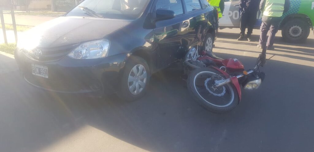 El sinestro tuvo lugar en la esquina de Almafuerte e Irlanda donde una motoccileta 125 cc color roja conducido por un joven mayor de edad impacto a un automovil Toyota conducido por una mujer mayor de edad.