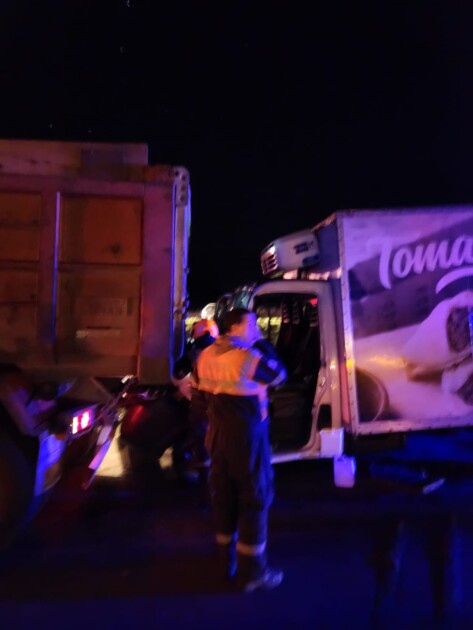 El siniestro ocurrió en el km 146 de la ruta nacional 9 carril Roasrio – Buenos Aires, alrededor de las 21 hs, según se pudo constatar dos camiones colisionaron por alcance, en uno de ellos circulaban dos personas, una de ellas quedo atrapada.