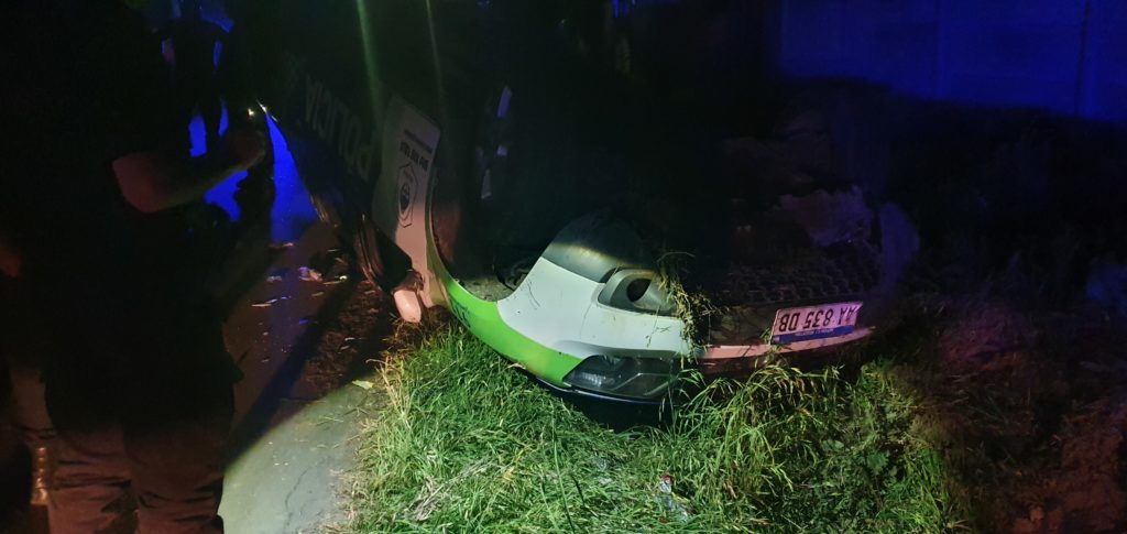En momentos en que respondían a un llamado para brindar una asistencia en la zona, chocaron en la intersección de Cruz Roja y Güemes con un automóvil Fiat. Como consecuencia de la maniobra, el vehículo oficial terminó volcado.