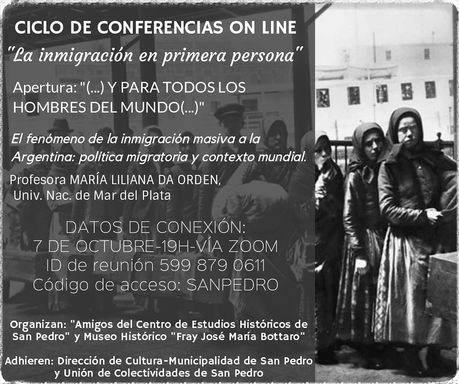 Este próximo MIÉRCOLES 7, a las 19 H, compartiremos el primer encuentro vía ZOOM, denominado «(…) Y PARA TODOS LOS HOMBRES DEL MUNDO (…)», a cargo de la Prof. María Lilian Da Orden de la Universidad Nacional de Mar del Plata.